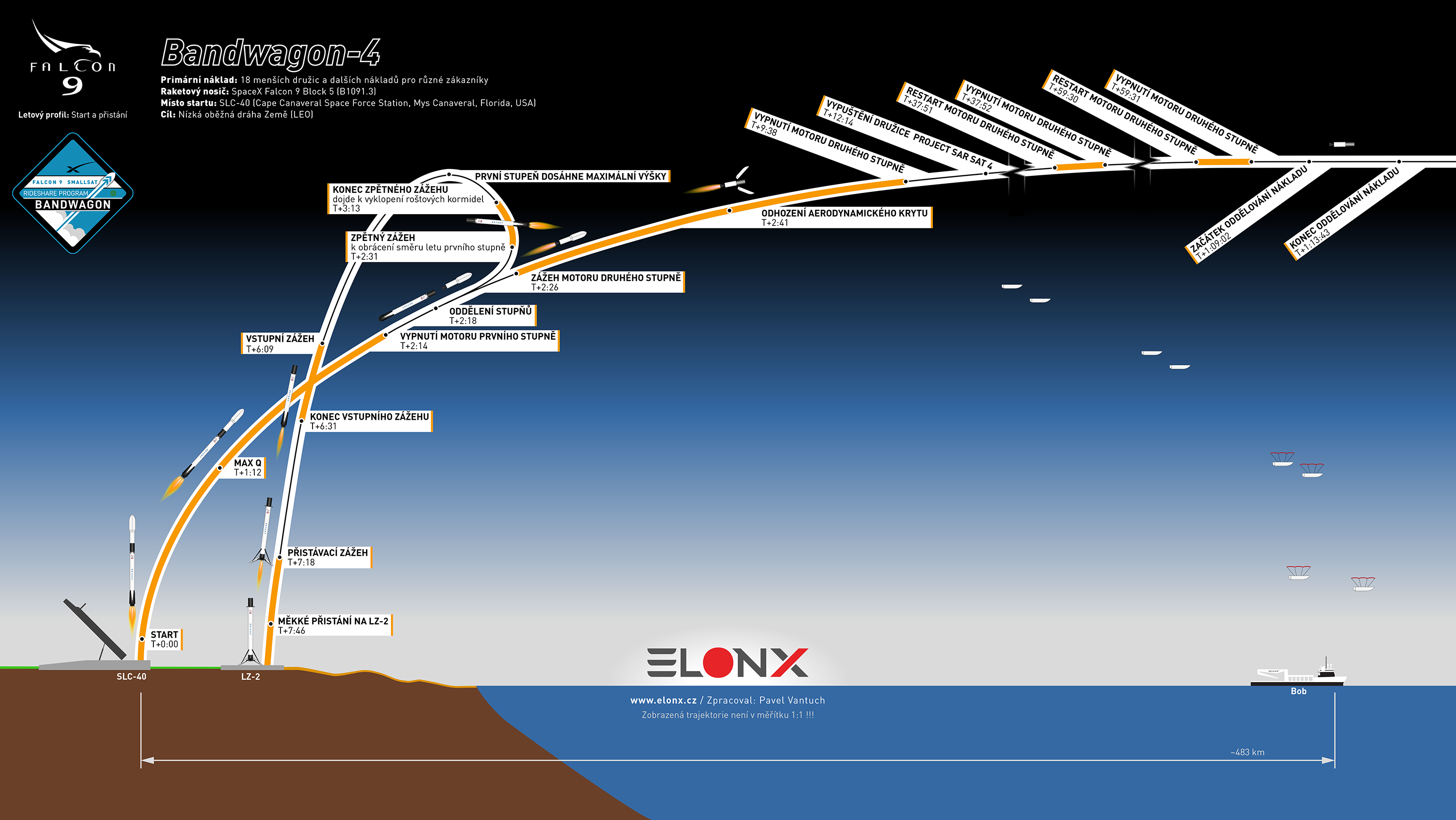- Šlo o čtvrtou misi programu Bandwagon. První start tohoto typu se odehrál v dubnu 2024 pod názvem Bandwagon-1. Vyneseno při něm bylo 11 družic pro různé zákazníky. Druhý start přišel na řadu v prosinci 2024, přičemž raketa SpaceX tehdy vynesla dalších 30 nákladů. Třetí a prozatím poslední mise Bandwagon s pořadovým číslem 3 se uskutečnila v dubnu letošního roku. Při ní se na oběžnou dráhu dostaly pouhopouhé tři družice. Celkově tedy při třech startech bylo na oběžnou dráhu dopraveno 44 malých družic a dalších nákladů.