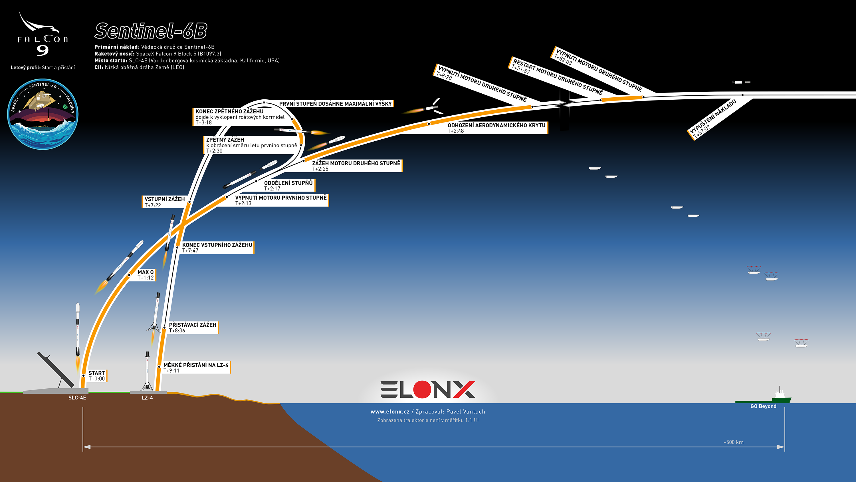 - V prosinci roku 2022 oznámila NASA, že družice Sentinel-6B bude vynesena v listopadu 2025 na raketě Falcon 9. Za tuto misi obdrží SpaceX 94 milionů dolarů. Není bez zajímavosti, že o této okolnosti jsme věděli už od září roku 2022, protože raketa Falcon 9 byla v době vyhlášení výběrového řízení jediným dostupným nosičem.