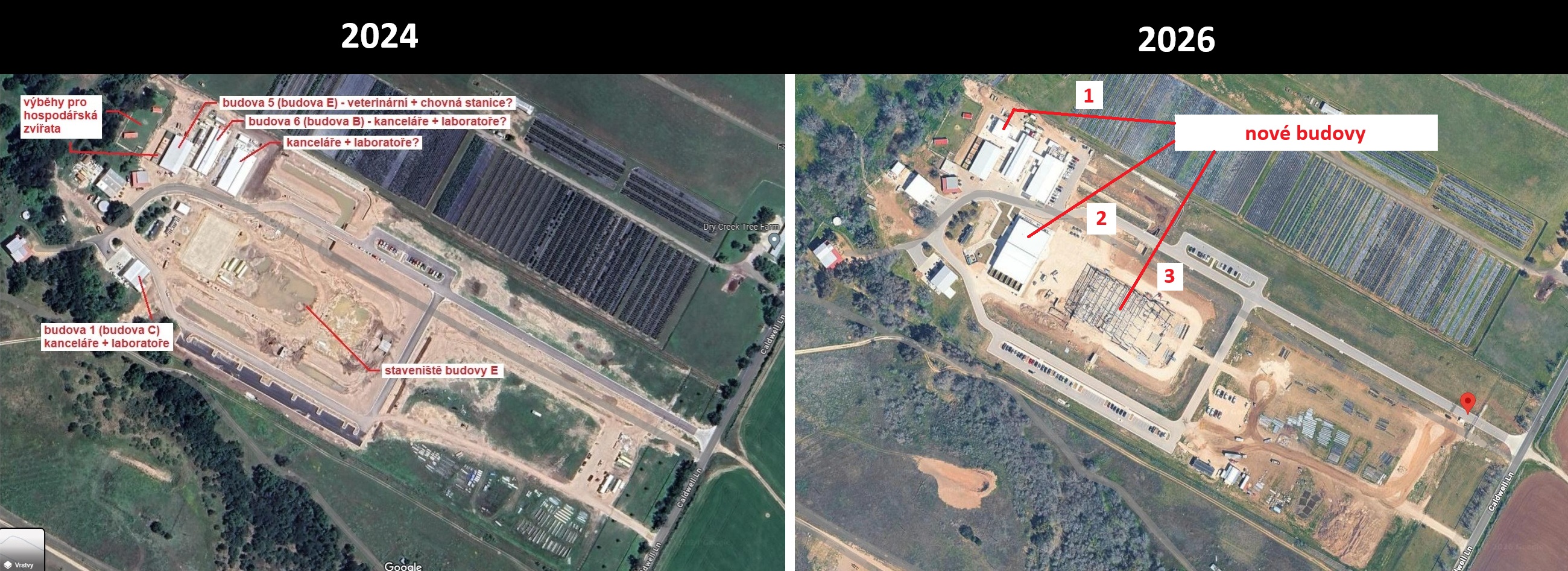 Budova výše není jedinou novostavbou na pozemku Neuralinku v Del Valle. Fotka S. E. Robinsona byla publikována v prosinci 2025. Pokud porovnáme archivní satelitní snímek z Google Maps z roku 2024 s tím současným, vidíme, že na pozemku kromě menších budov vyrostly ještě dvě větší, a další, zřejmě zatím největší v celém areálu, je v rané fázi výstavby.