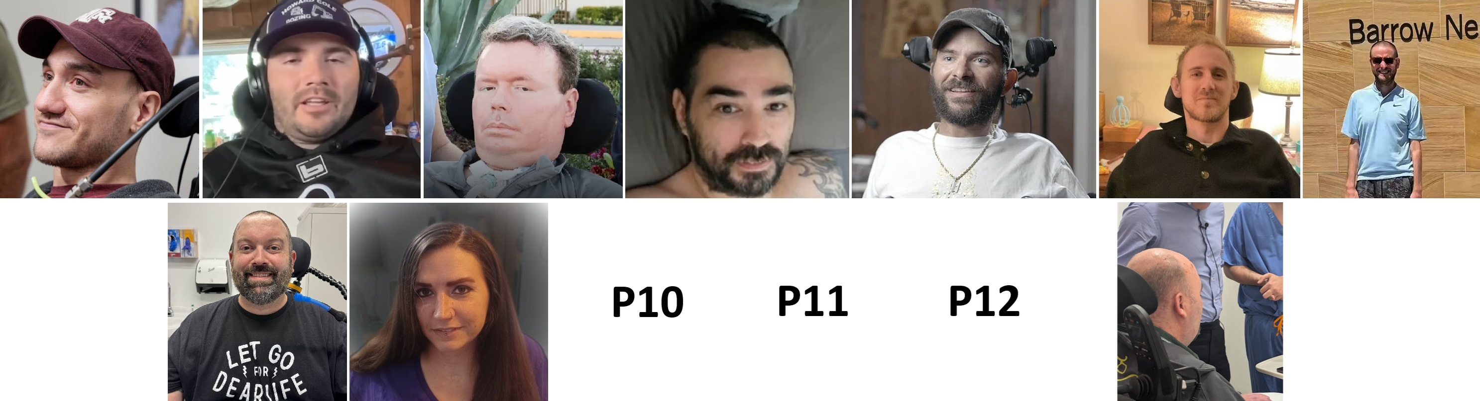Uživatelé Neuralinku. Horní řada zleva: Noland Arbaugh (P1), Alex Conley (P2), Bradford G. Smith (P3), Mike (P4), RJ (P5), Rob Greiner (P6), Jake Schneider (P7), Dolní řada zleva: Nick Wray (P8), Audrey Crews (P9), P10, P11, P12, Paul (P13).